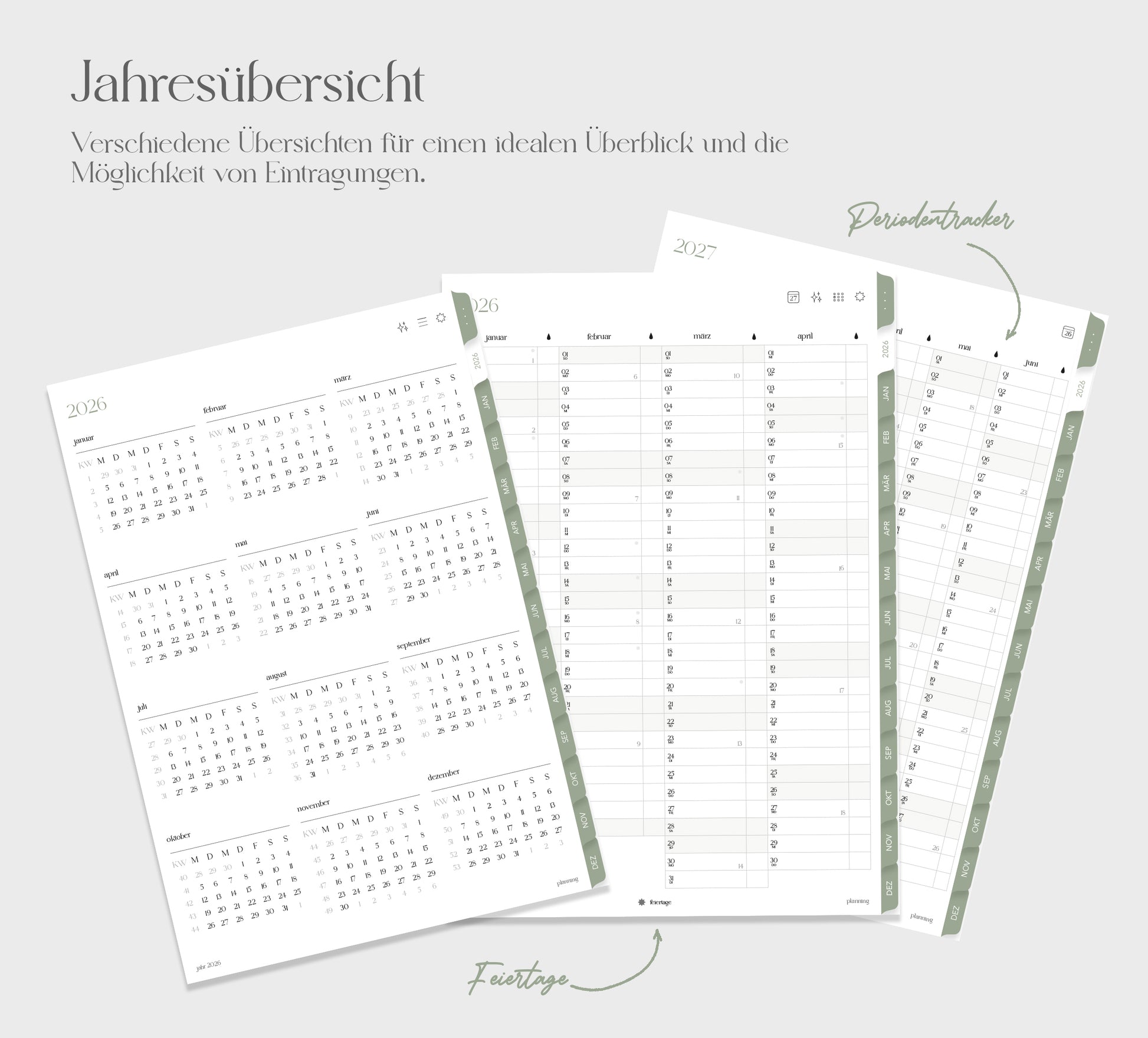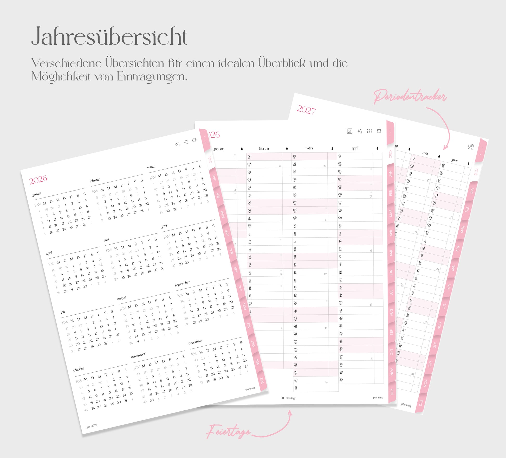 - Jahresübersichten 2026 (Raster + Tabelle) mit Periodentracker