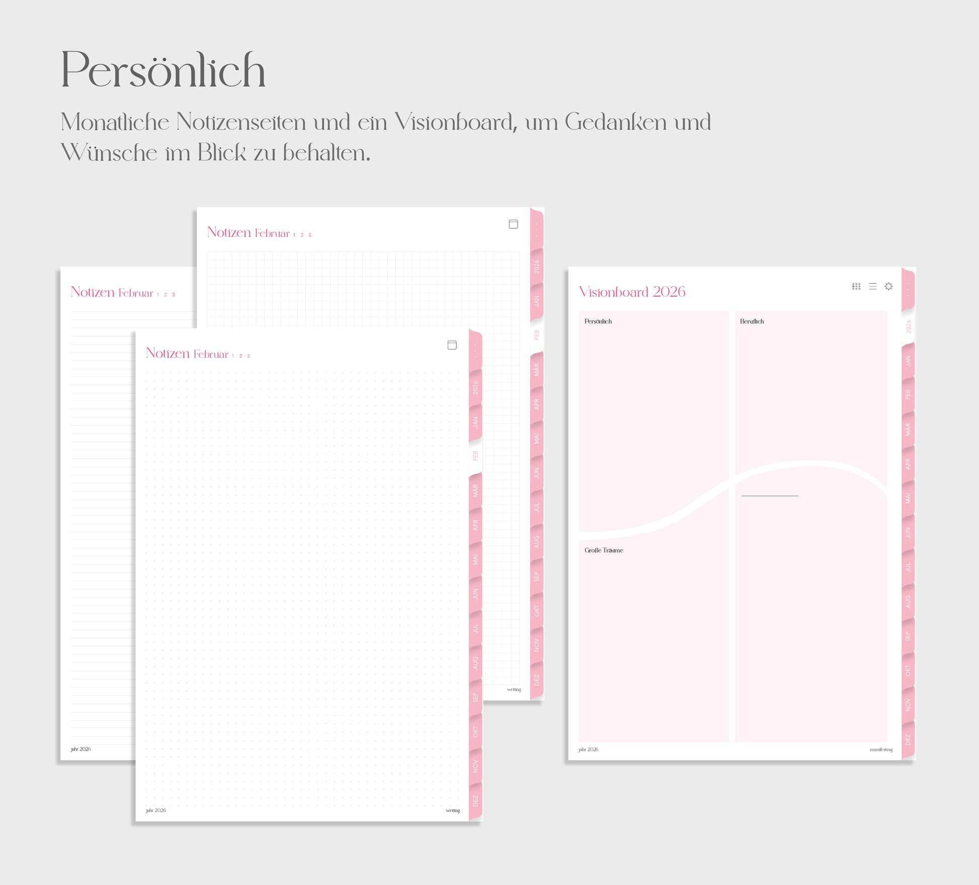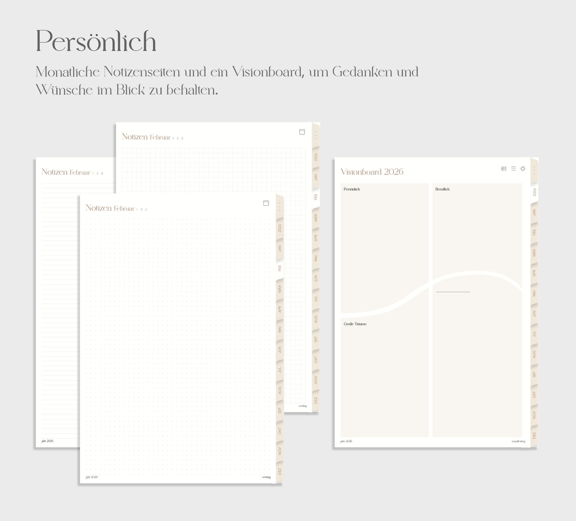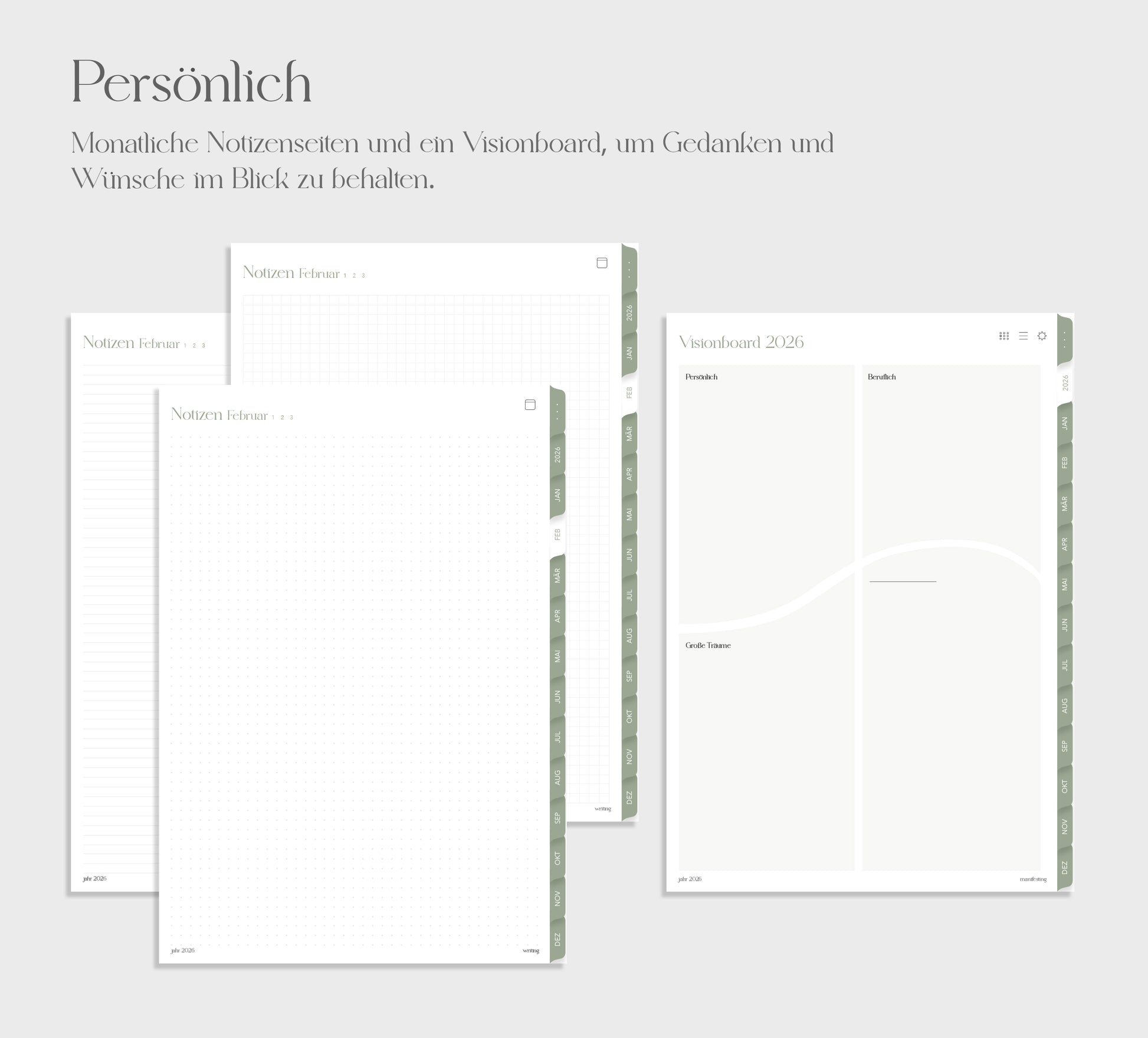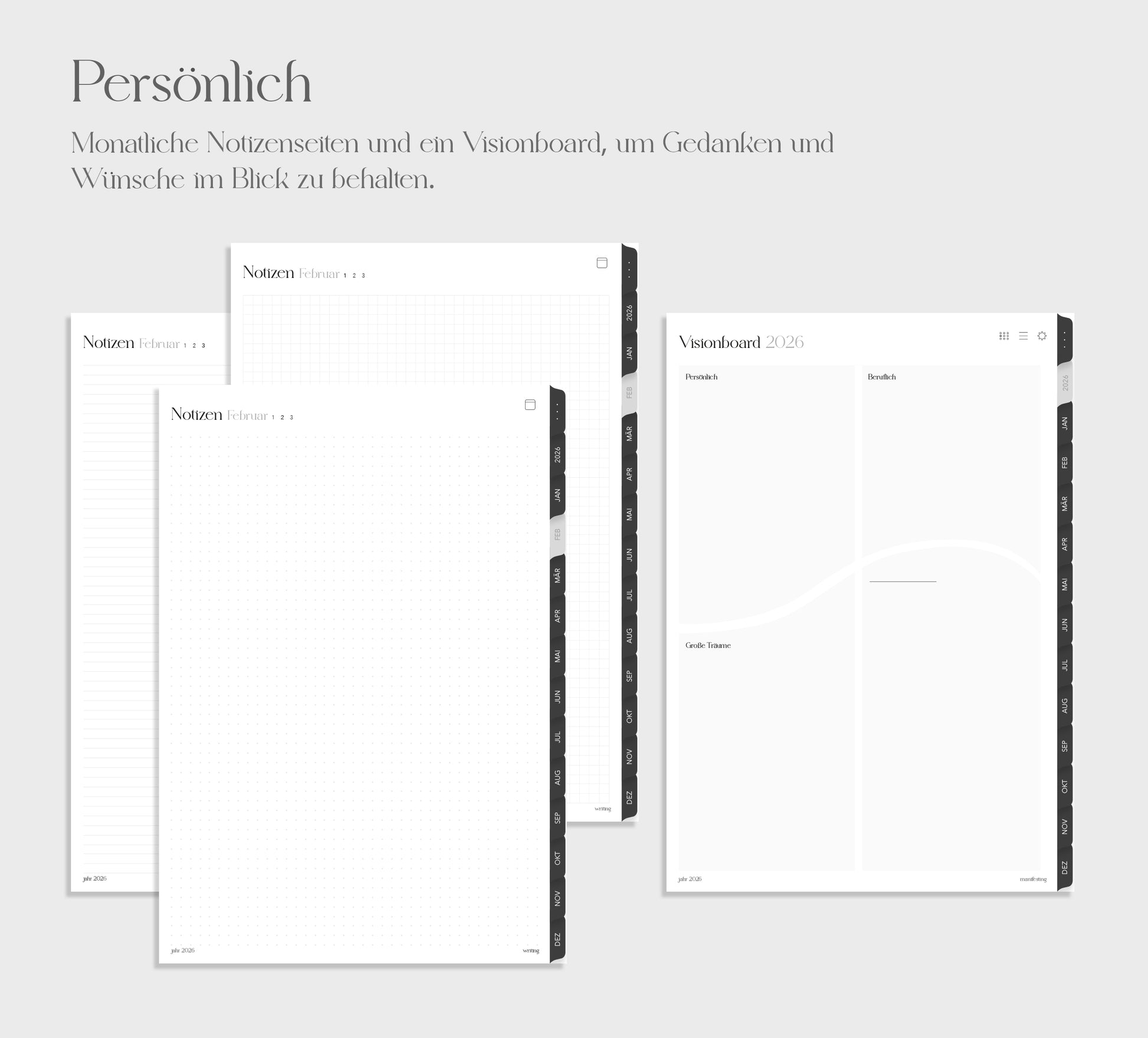- Monatliche Notizseiten (kariert, liniert, dotted)