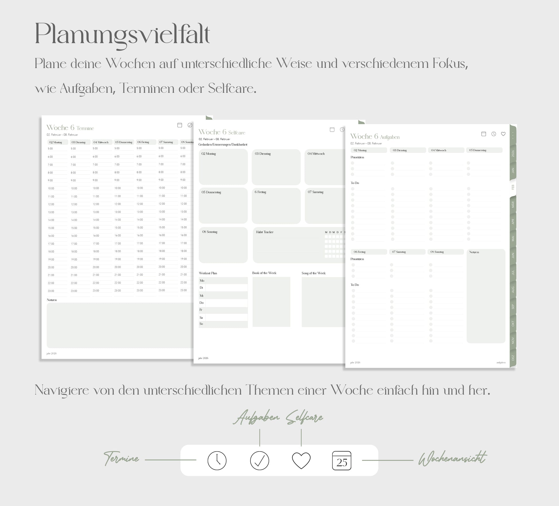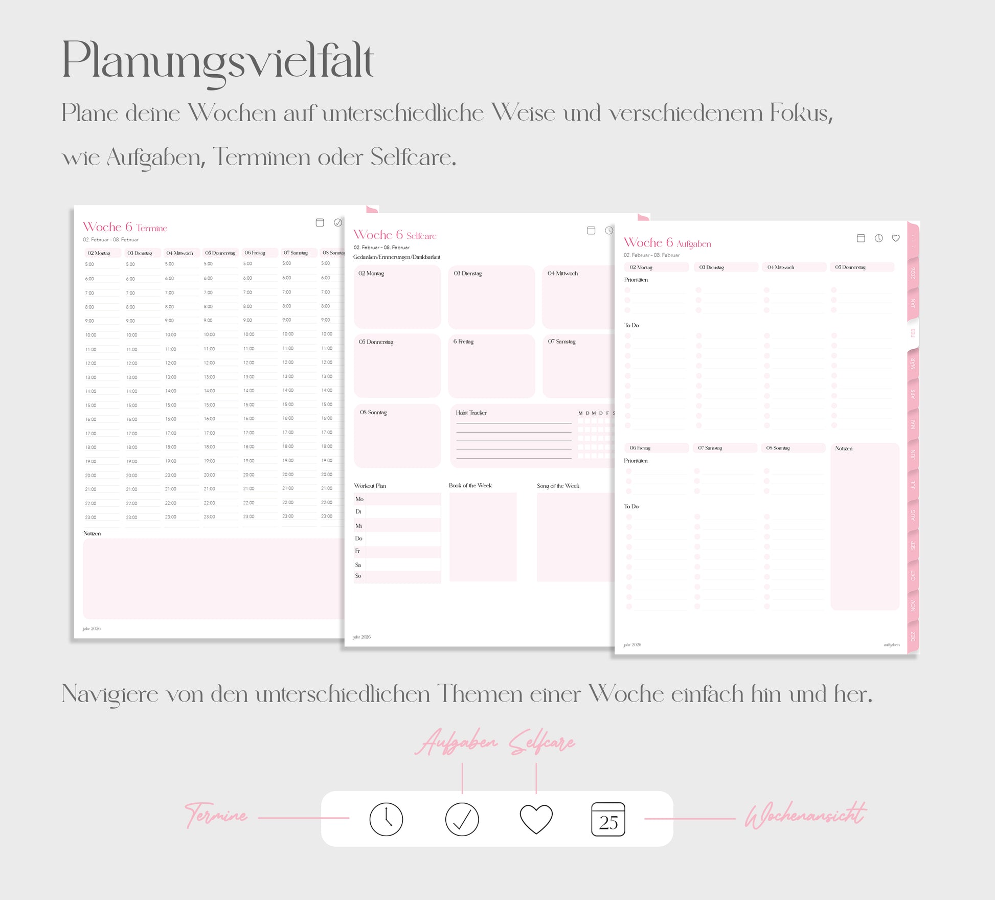 Dieser digitale Planer fokussiert sich, anders als unser klassischer Planer, auf die Planung der Wochen im Jahr und ist ideal für alle, die die Tagesübersichten nicht brauchen. Er erscheint in einem klassischem und eleganten Design und ist in den Farben schwarz, grün, rosa oder beige verfügbar. Die verschiedenen Wochentemplates bieten die Möglichkeit, die Planung auf verschiedenen Ebenen, wie Selfcare, Termine oder Aufgaben zu heben. Das minimalistische Design hilft dir dabei, dich auf das Wesentliche zu fokussieren und stets den Überblick zu behalten. Ebenso bietet der Kalender viel Raum für eine persönliche Entfaltung. Durch die Hyperlinks und einem Register ist der Kalender schnell und einfach zu bedienen.