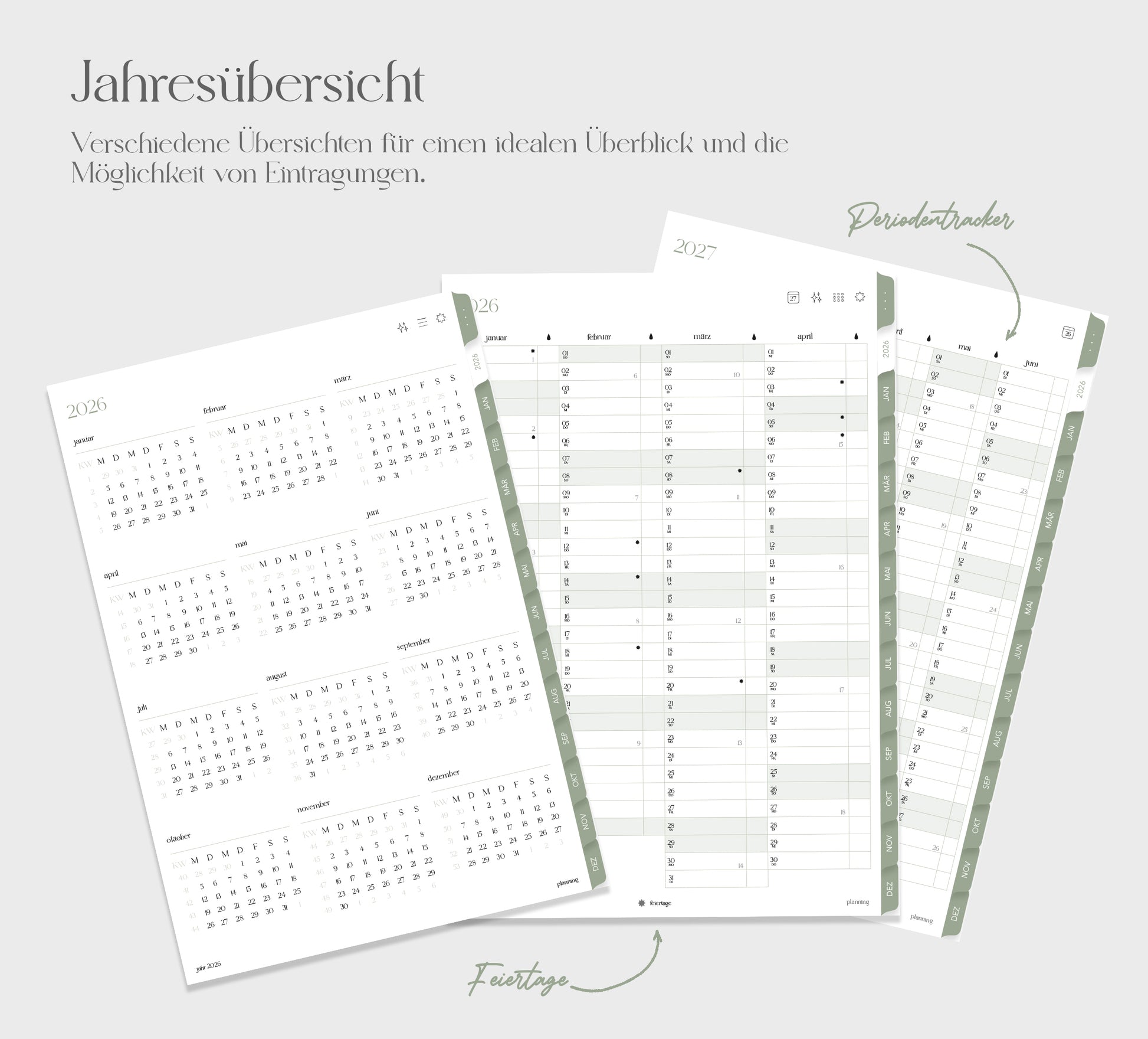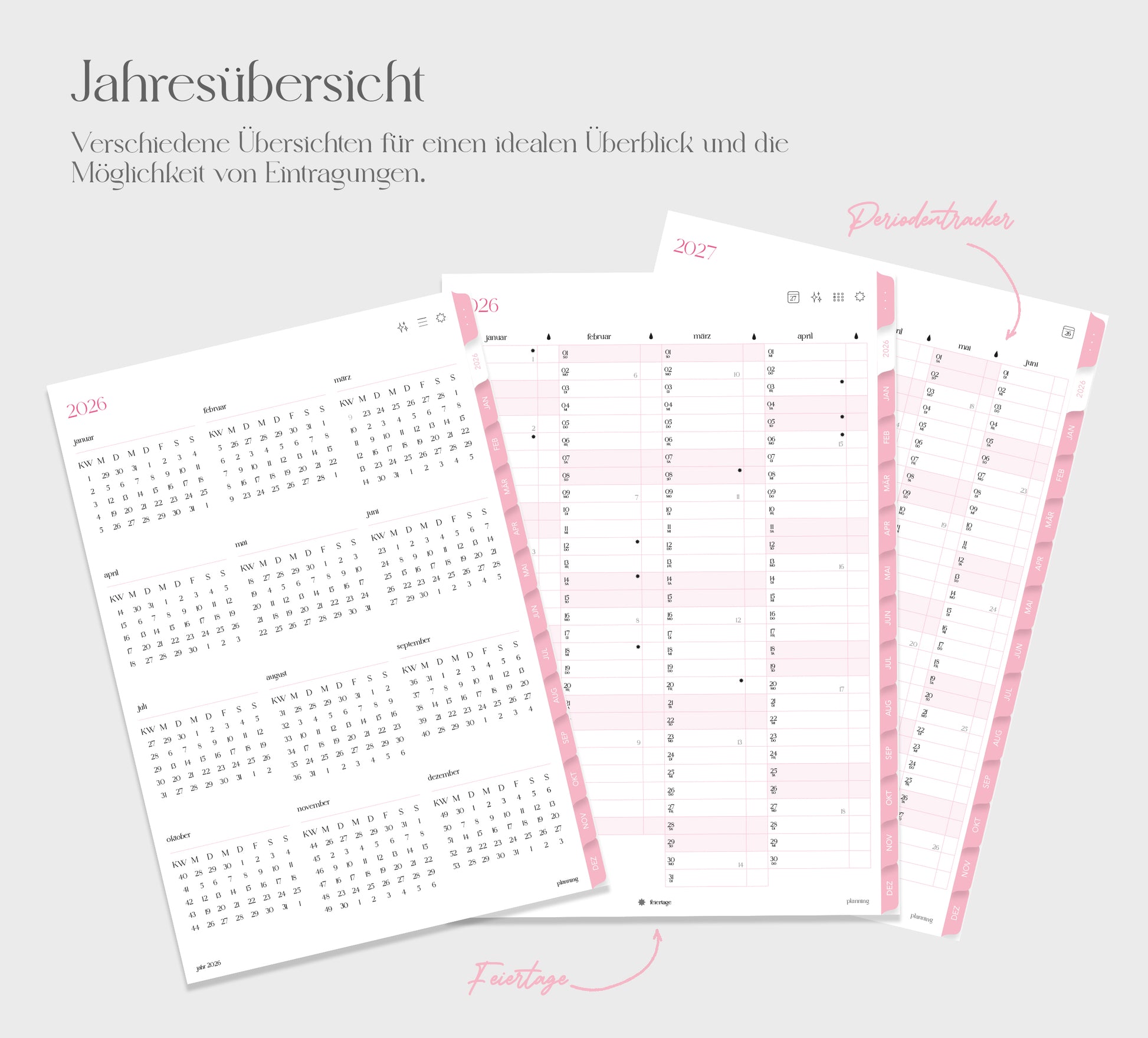 - Jahresübersichten 2026 (Raster + Tabelle) mit Periodentracker